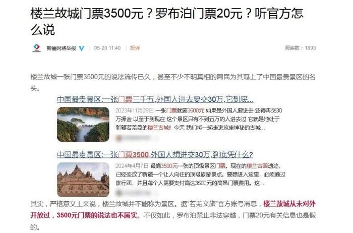 文章稱, ?樓蘭故城一張門票3500元的說法流傳已久,甚至不少不明真相的網(wǎng)民為其冠上了中國最貴景區(qū)的名頭。其實,嚴格意義上來說,樓蘭故城并不能稱為景區(qū)。據(jù)“若羌文旅”官方賬號消息,樓蘭故城從未對外開放過,3500元門票的說法也不屬實。不僅如此,羅布泊禁止非法穿越,門票20元有關(guān)信息也是假的。
