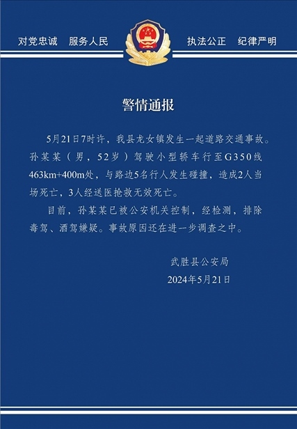 央視網(wǎng)消息:據(jù)平安武勝微信公眾號消息,5月21日7時(shí)許,武勝縣龍女鎮(zhèn)發(fā)生一起道路交通事故,孫某某(男,52歲)駕駛小型轎車行至G350線463km+400m處,與路邊5名行人發(fā)生碰撞,造成2人當(dāng)場死亡,3人經(jīng)送醫(yī)搶救無效死亡。目前,孫某某已被公安機(jī)關(guān)控制,經(jīng)檢測,排除毒駕、酒駕嫌疑。事故原因還在進(jìn)一步調(diào)查之中。