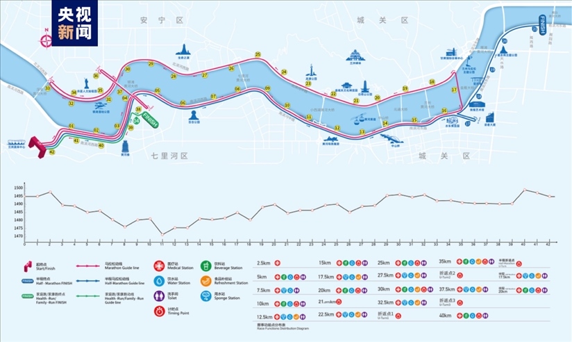 馬拉松所有項目起點為蘭州奧體中心,全程馬拉松終點與起點相同,半程馬拉松終點在南濱河?xùn)|路(軌道二號線雁白大橋站附近),健康跑和家庭跑終點在馬灘北路十字。