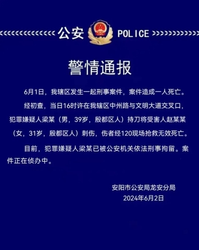 央視網(wǎng)消息:河南安陽(yáng)市公安局龍安分局6月2日發(fā)布警情通報(bào):6月1日,轄區(qū)發(fā)生一起刑事案件,案件造成一人死亡。經(jīng)初查,當(dāng)日16時(shí)許在轄區(qū)中州路與文明大道交叉口,犯罪嫌疑人梁某 (男,39歲,殷都區(qū)人)持刀將受害人趙某某(女,31歲,殷都區(qū)人)刺傷,傷者經(jīng)120現(xiàn)場(chǎng)搶救無(wú)效死亡。目前,犯罪嫌疑人梁某已被公安機(jī)關(guān)依法刑事拘留。案件正在偵辦中。