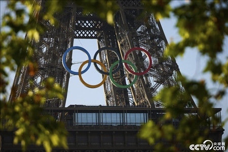 當?shù)貢r間2024年6月7日,在巴黎奧運會開幕倒計時50天之際,奧運五環(huán)被安裝在巴黎埃菲爾鐵塔上。