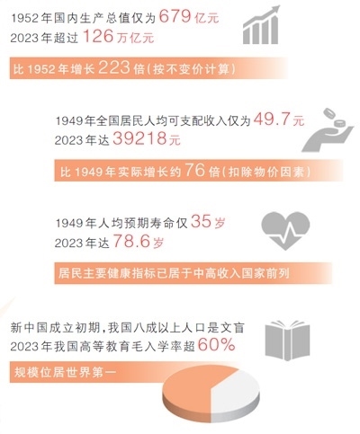 各行各業(yè)的發(fā)展成就,人民生活的蒸蒸日上,濃縮在一組組數(shù)據(jù)中。與新中國成立初期相比,2023年國內(nèi)生產(chǎn)總值增長223倍、人均GDP增長89倍、人均預(yù)期壽命提高43.6歲、農(nóng)村貧困人口全部脫貧……國家統(tǒng)計(jì)局近日發(fā)布新中國成立75年經(jīng)濟(jì)社會發(fā)展成就系列報(bào)告,“數(shù)”說75年偉大成就,本版“大數(shù)據(jù)觀察”欄目推出特別報(bào)道,記錄同心同德、艱苦奮斗的奮進(jìn)歷程,匯聚共襄強(qiáng)國建設(shè)、民族復(fù)興偉業(yè)的磅礴力量。