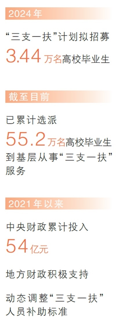 在奮斗中書寫青春華章,在奉獻中成就事業(yè)。2006年“三支一扶”計劃開展以來,50多萬名高校畢業(yè)生扎根鄉(xiāng)村,開展支教、支農(nóng)、支醫(yī)等服務。2024年,“三支一扶”計劃擬招募3.44萬名高校畢業(yè)生到基層開展相關服務。