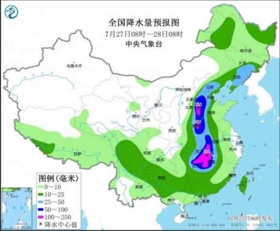 全國強降雨落區(qū)預(yù)報圖(7月25日08時-26日08時)