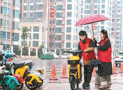 江西贛州興國(guó)縣長(zhǎng)征社區(qū)志愿者在街頭整理共享單車(chē)。陳 鵬攝(人民視覺(jué))