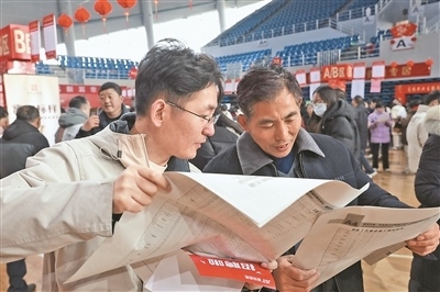 2月3日,求職者在江蘇省揚州市寶應縣新春大型人力資源招聘洽談會上尋找就業(yè)崗位。