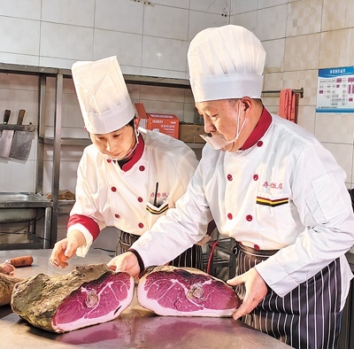 宣威市存香飯店,大廚徐天勇正忙著挑選食材,而烏金豬是制作宣威火腿的最佳原料。“腌制過程也很重要,鹽的比例要恰到好處,多一分則咸,少一分則不夠味,經(jīng)過兩三年發(fā)酵,火腿就可以達(dá)到生吃的標(biāo)準(zhǔn)了?!毙焯煊掠霉轻樰p輕插入火腿的上、中、下部,火腿肉質(zhì)清香撲鼻,“就是它了?!?/p>