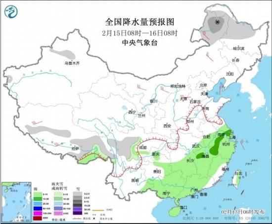 全國降水量預報圖(2月15日08時-16日08時) 圖片來源:中央氣象臺網(wǎng)站