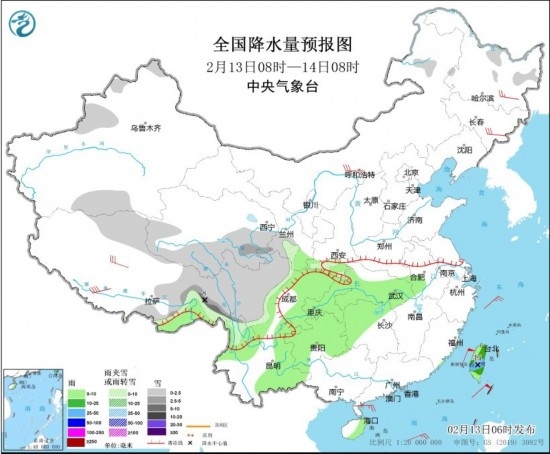 全國降水量預報圖(2月13日08時-14日08時) 圖片來源:中央氣象臺網(wǎng)站