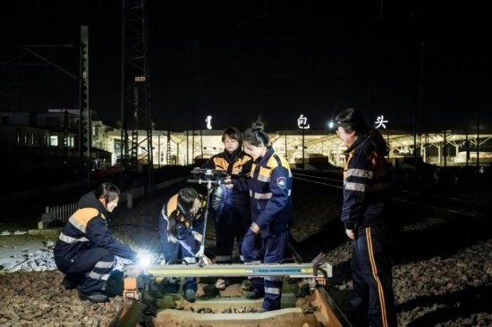 包頭工務(wù)段“女子監(jiān)控分析班組”正在進(jìn)行現(xiàn)場作業(yè)。(王日森 攝)