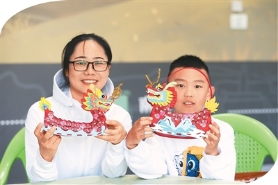 在青海省西寧市博物館舉辦的端午節(jié)主題活動(dòng)中,家長和小朋友展示制作的龍舟擺件。