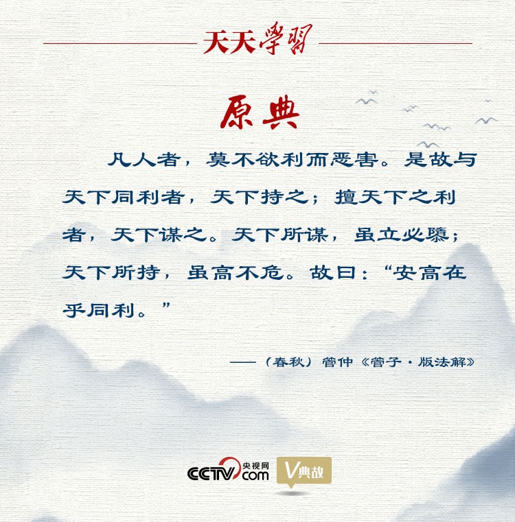 “利民”是管子民本思想的重要內(nèi)容。管子認(rèn)為,“得人之道,莫如利之”,強(qiáng)調(diào)治國者必須善于與民同利。他從人的自然本性加以闡述,“凡人者,莫不欲利而惡害”,認(rèn)為趨利避害是人的本能。因此,“與天下同利者,天下持之;擅天下之利者,天下謀之”。與天下人同利的,天下人就擁護(hù)他;獨占天下人利益的,天下人就圖謀他。管子的上述觀點是對姜尚“同天下之利者,則得天下;擅天下之利者,則失天下”思想的繼承。