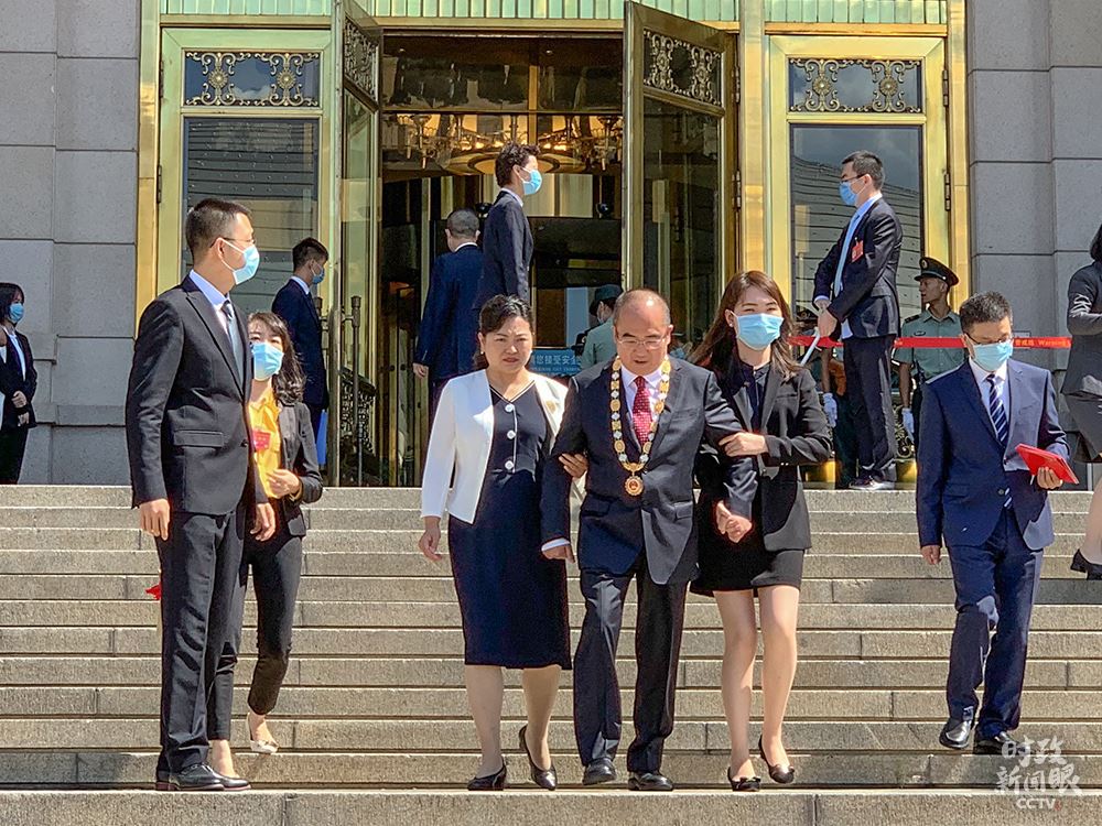 △表彰大會(huì)結(jié)束后,患有漸凍癥、行走不便的張定宇被攙扶著走出大會(huì)堂。(總臺(tái)央視記者王志明拍攝)