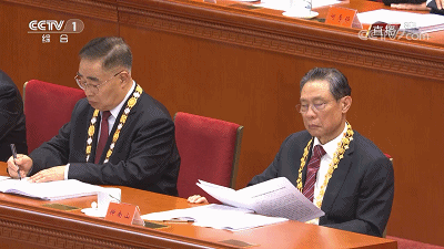 △鐘南山、張伯禮、張定宇、陳薇就座主席臺(tái)上。