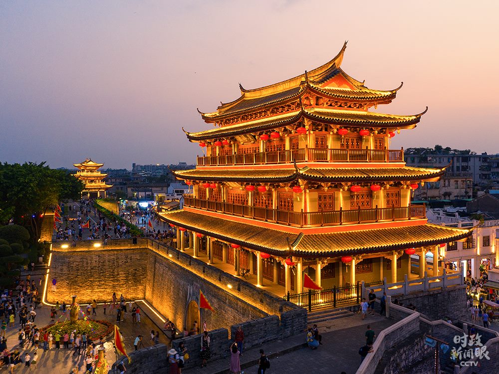 △修復(fù)后的廣濟(jì)門城樓高24.5米,城樓上的“東為萬春”和“嶺東首邑”分別由國(guó)際漢學(xué)大師饒宗頤、書法家劉炳森題寫。(總臺(tái)央視記者楊立峰拍攝)
