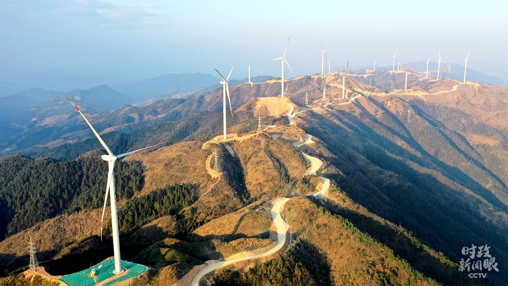△廣西柳州,三江侗族自治縣大力發(fā)展清潔能源產(chǎn)業(yè),一字排開(kāi)的風(fēng)力發(fā)電機(jī)成為侗鄉(xiāng)新地標(biāo)。