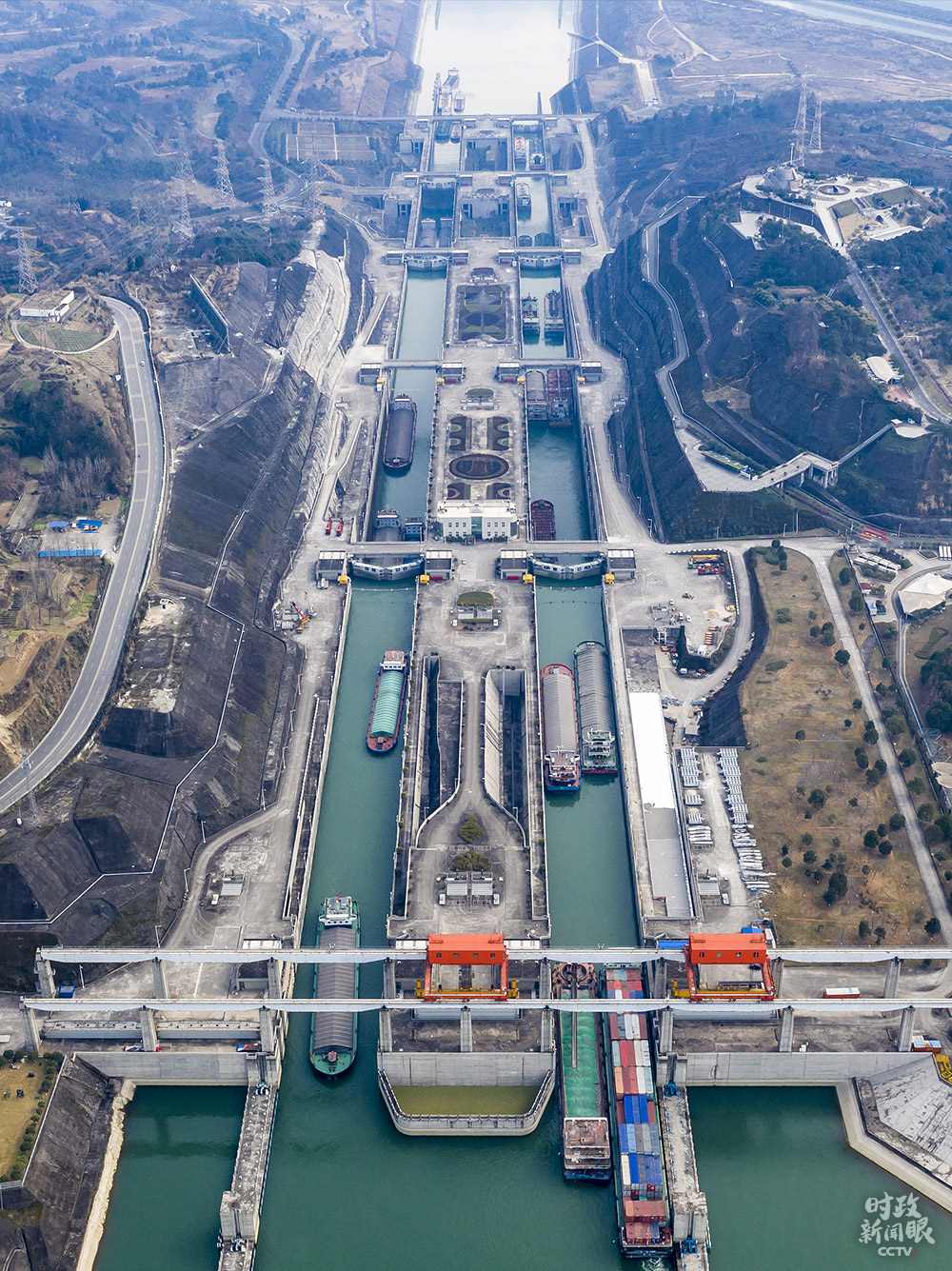 △1月10日,湖北宜昌,船舶有序行駛在三峽五級(jí)船閘。