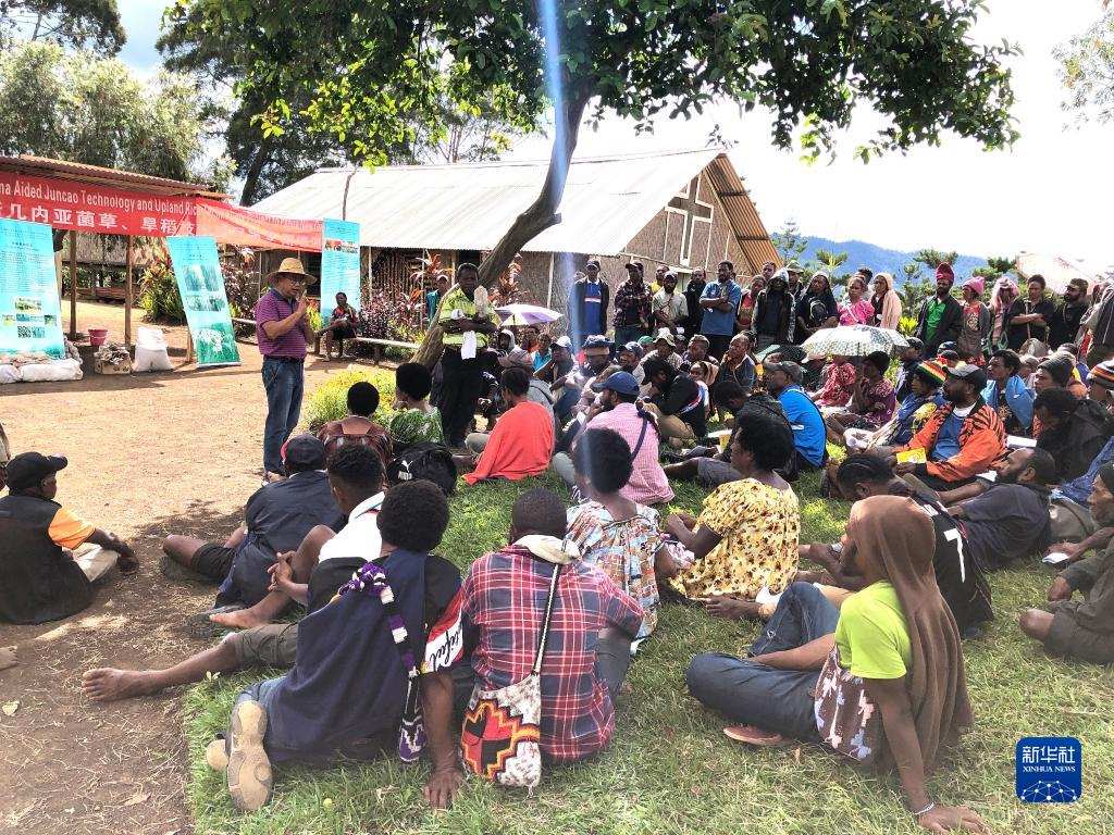 2020年12月15日,中國(guó)援巴布亞新幾內(nèi)亞菌草旱稻項(xiàng)目專家組組長(zhǎng)林應(yīng)興(戴草帽者)在巴布亞新幾內(nèi)亞東高地省中國(guó)援助巴新菌草和旱稻技術(shù)項(xiàng)目第9期培訓(xùn)班上授課。新華社發(fā)