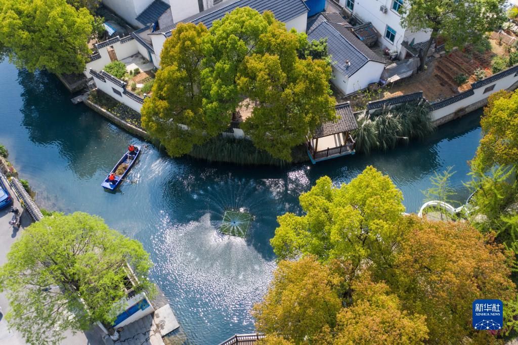 在浙江省長(zhǎng)興縣龍山街道渚山村,保潔人員進(jìn)行日常河道護(hù)理巡查(2020年4月9日攝,無人機(jī)照片)。新華社記者徐昱攝