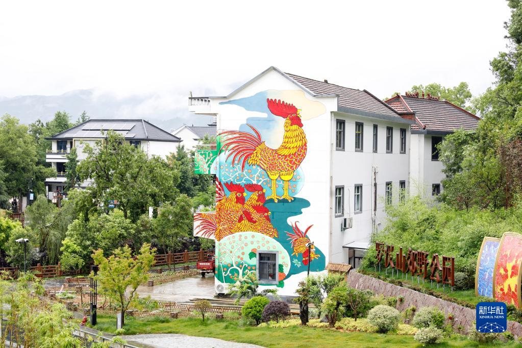 這是浙江衢州市柯城區(qū)溝溪鄉(xiāng)余東村建筑墻壁上的農(nóng)民畫(huà)“大公雞”(5月11日攝)。新華社發(fā)