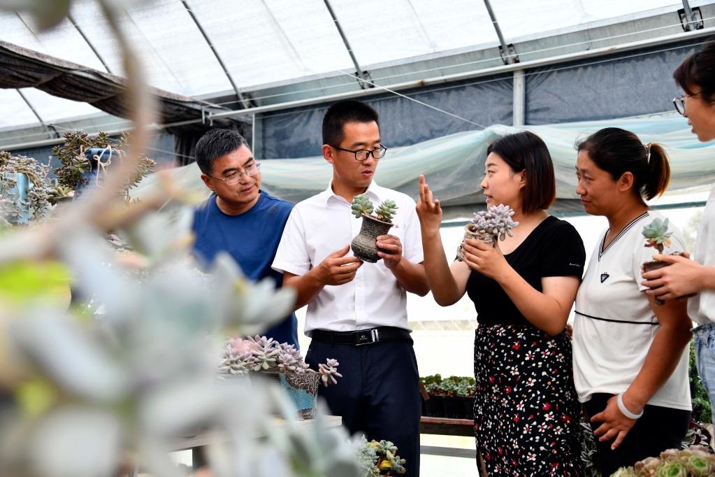 2020年6月9日,在濟(jì)南市章丘區(qū)三澗溪村農(nóng)業(yè)創(chuàng)業(yè)園,青年創(chuàng)業(yè)黨支部書記王元虎(左二)和青年黨員一起商量發(fā)展事宜。新華社記者王凱攝