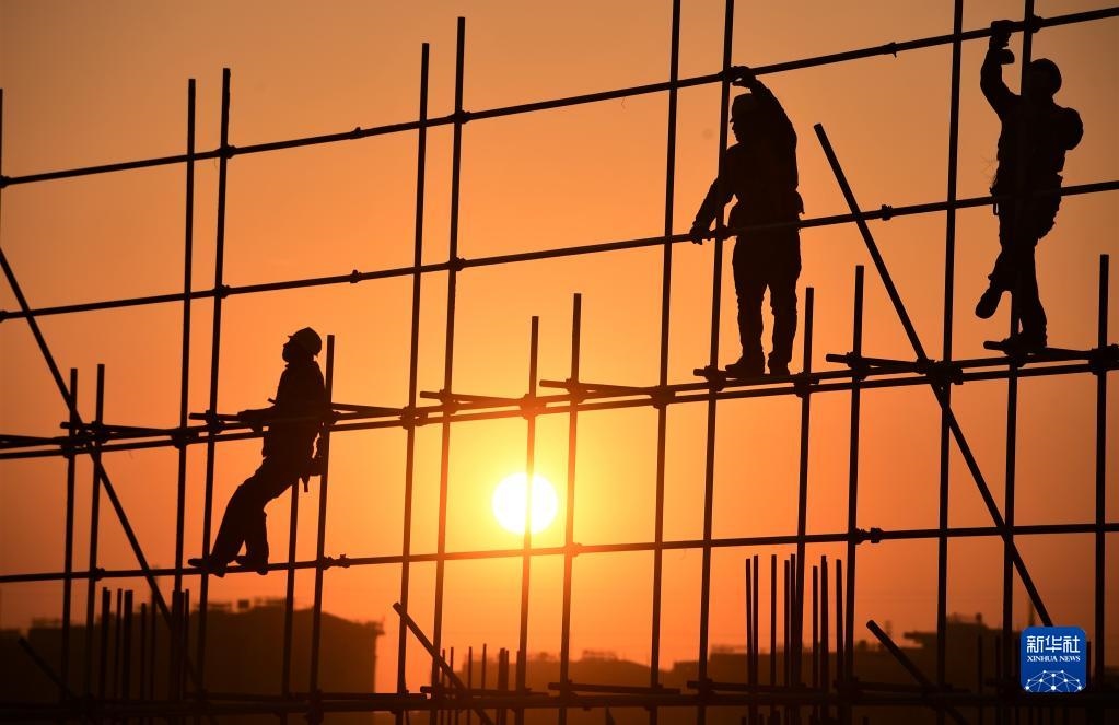 2022年1月1日,在河北雄安新區(qū)容西安置房項(xiàng)目D標(biāo)段施工現(xiàn)場(chǎng),中鐵上海工程局工人在新年第一縷陽(yáng)光的照耀下工作。新華社發(fā)(傅新春 攝)