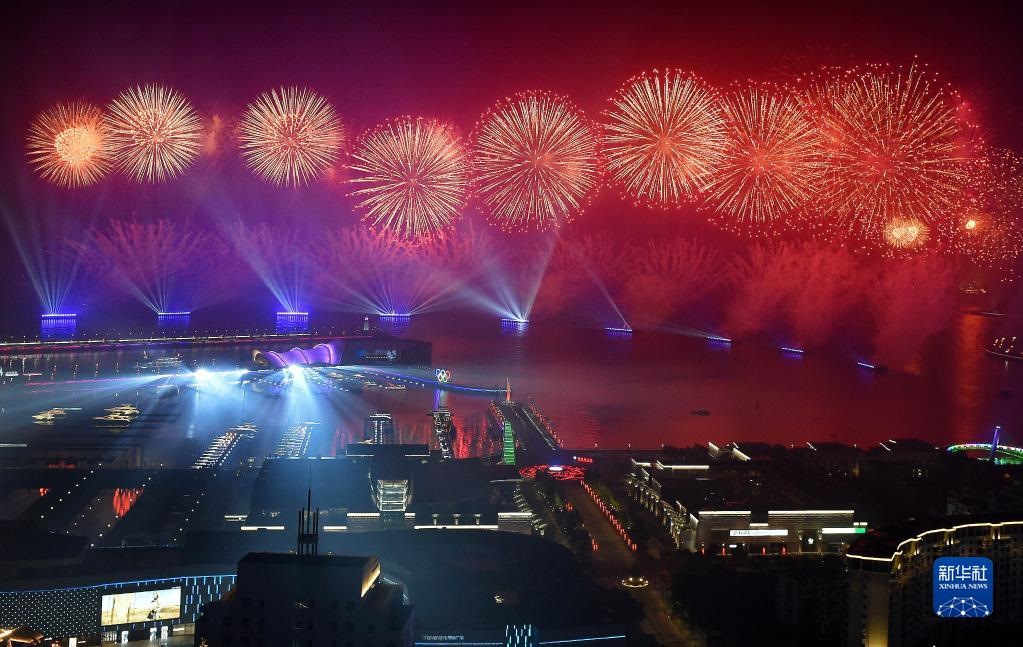 這是在青島舉行的《有朋自遠(yuǎn)方來》燈光焰火藝術(shù)表演(2018年6月9日晚攝)。2018年6月9日至10日,上海合作組織成員國元首理事會第十八次會議在青島召開。新華社記者李紫恒攝