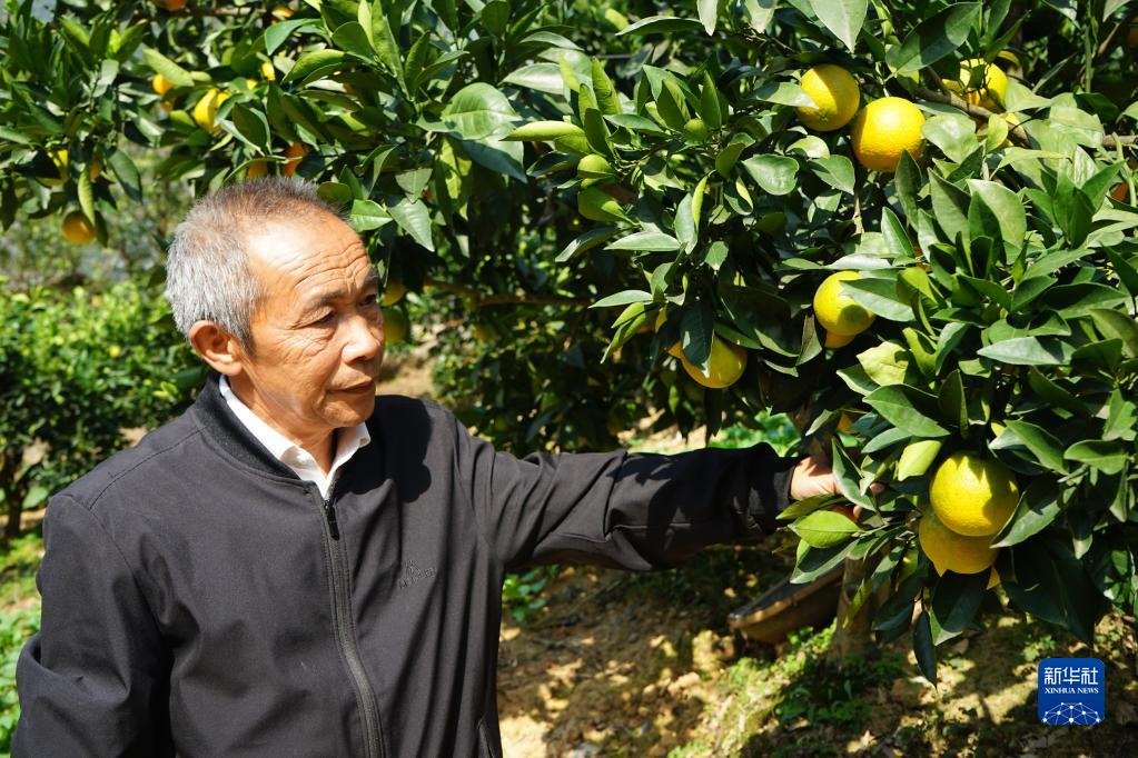 10月16日,全國脫貧攻堅(jiān)楷模、重慶市巫山縣下莊村黨支部書記毛相林在自家柑橘園中查看柑橘長勢。新華社記者 李曉婷 攝