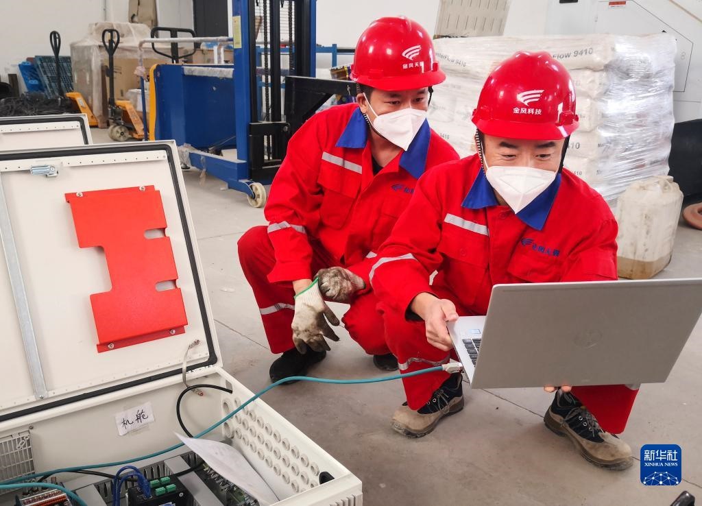 10月16日,在新疆烏魯木齊金風(fēng)科技天翼達(dá)坂城試驗(yàn)風(fēng)電場,場長張新旺(右)和同事一起工作。新華社發(fā)(周凱 攝)