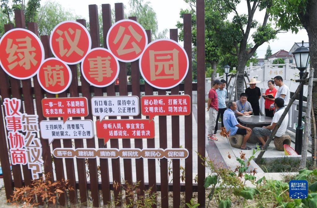 在浙江省湖州市長興縣呂山鄉(xiāng)龍溪村的議事公園內(nèi),田園議事會成員開展討論協(xié)商(2022年7月21日攝)。新華社記者 徐昱 攝