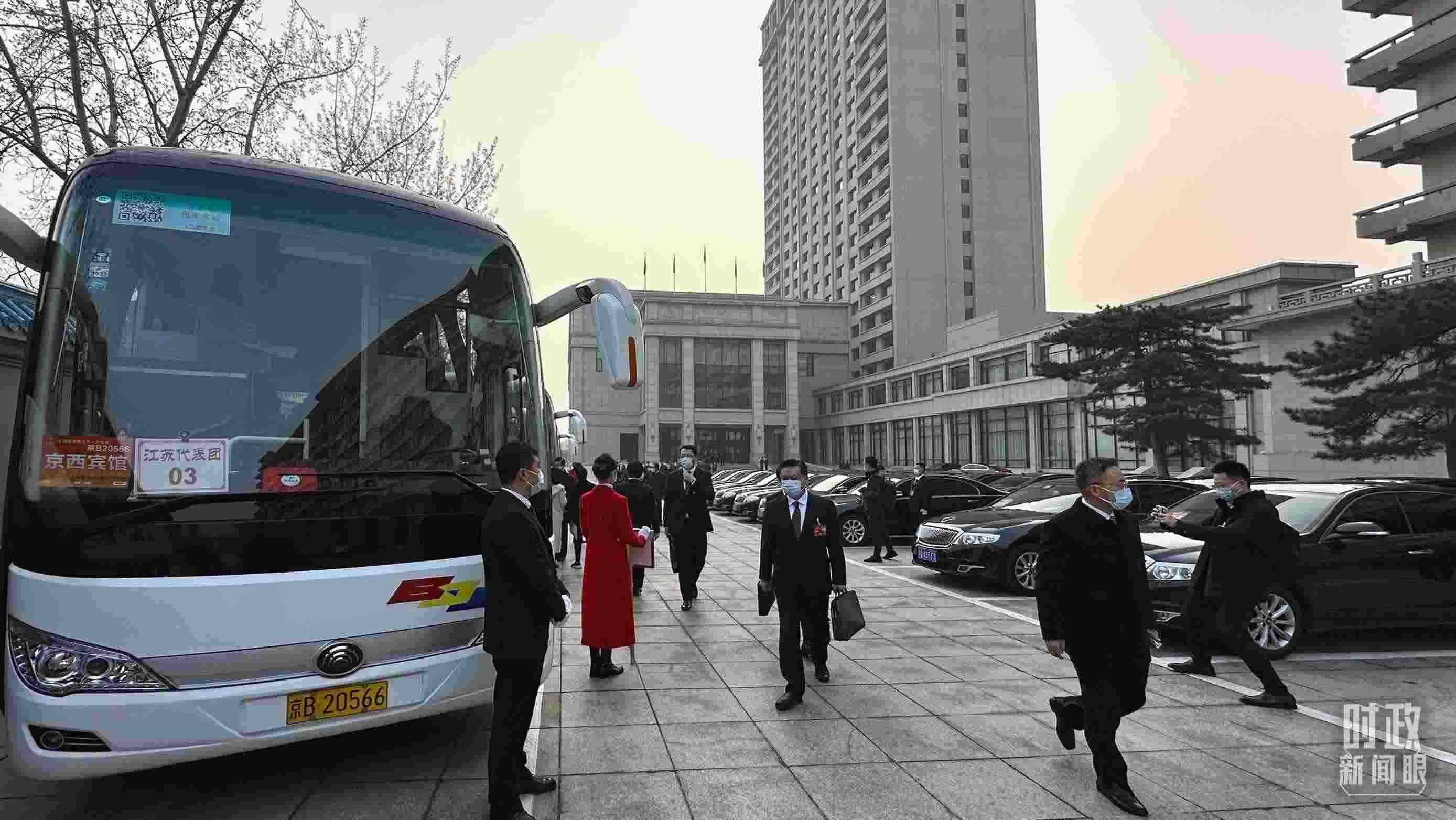 △2023年3月5日,江蘇代表團乘車前往人民大會堂。(江蘇省廣播電視總臺記者 周明、張正拍攝)