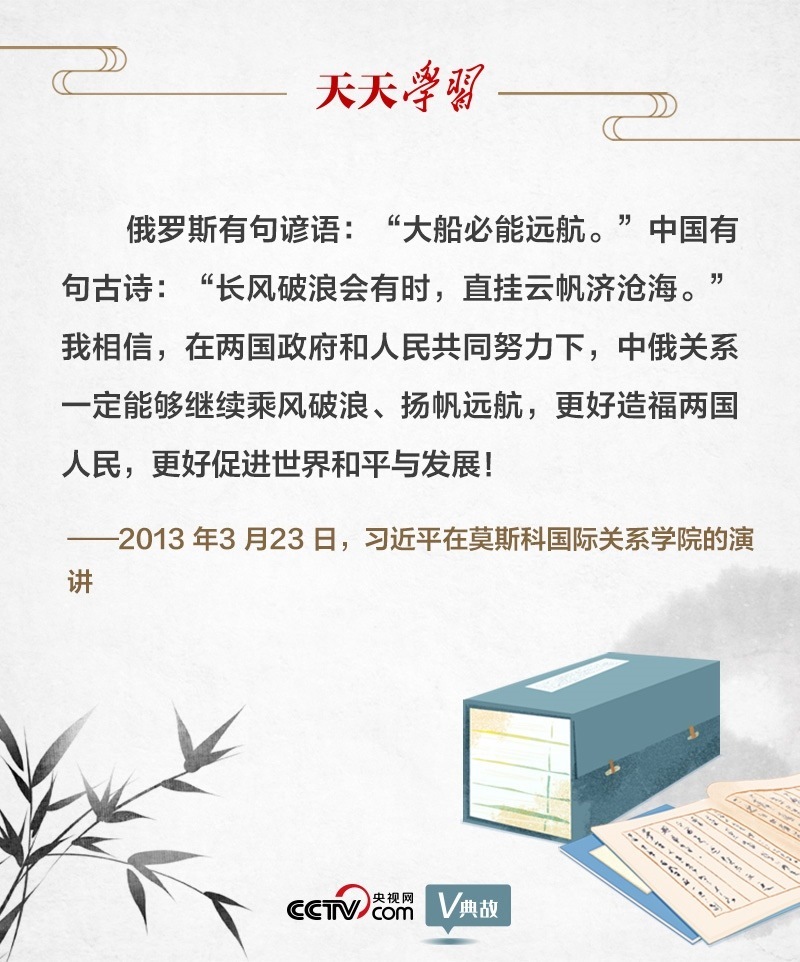 關(guān)于中俄關(guān)系,早在10年前在莫斯科國(guó)際關(guān)系學(xué)院的演講中,習(xí)近平主席就有精辟闡述。演講結(jié)束語(yǔ)中,習(xí)主席首先引用一句俄羅斯諺語(yǔ)“大船必能遠(yuǎn)航”,拉近了與俄羅斯民眾的文化空間和心理距離。接著引用了含義相近的中國(guó)古詩(shī)“長(zhǎng)風(fēng)破浪會(huì)有時(shí),直掛云帆濟(jì)滄海”,讓對(duì)方在文化相似性中深刻領(lǐng)悟其中道理。最后凝聚共同理念:“中俄關(guān)系一定能夠繼續(xù)乘風(fēng)破浪、揚(yáng)帆遠(yuǎn)航”。