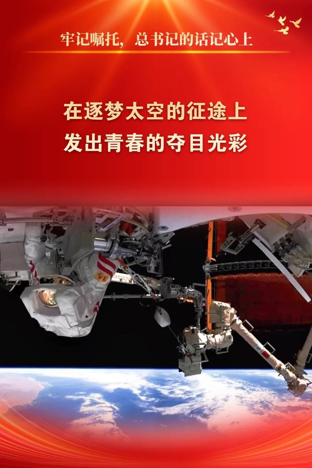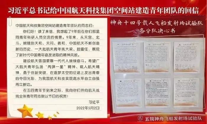 2022年5月2日,習近平總書記給中國航天科技集團空間站建造青年團隊回信,高度肯定航天青年,殷切期待青春奮斗。他強調(diào):“希望廣大航天青年弘揚‘兩彈一星’精神、載人航天精神,勇于創(chuàng)新突破,在逐夢太空的征途上發(fā)出青春的奪目光彩,為我國航天科技實現(xiàn)高水平自立自強再立新功?!币荒陙?,五院人持續(xù)學習重溫、堅決貫徹落實習近平總書記重要回信精神和關于航天強國建設的重要指示批示精神,始終做到牢記囑托、感恩奮進,交出非凡“答卷”。
