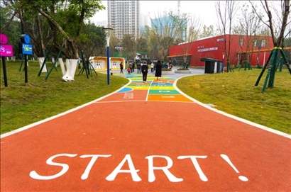 △重慶兩江新區(qū)生活垃圾分類主題公園分類知識通關(guān)步道。該形式在寓教于樂中推廣垃圾分類知識。