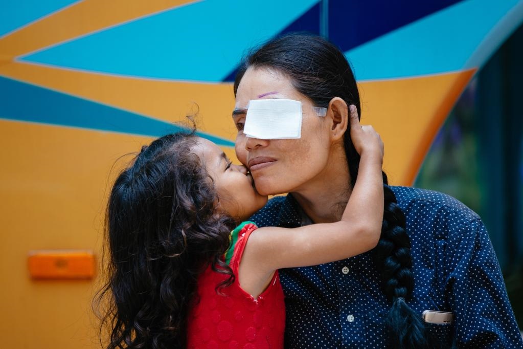 2019年3月15日,在柬埔寨磅湛省醫(yī)院,即將接受白內(nèi)障手術(shù)的患者孫美樂接受女兒的親吻祝福。在接受了中國醫(yī)療隊(duì)的白內(nèi)障義診手術(shù)后,她的視力逐步恢復(fù),生活有了新的光明和希望。
