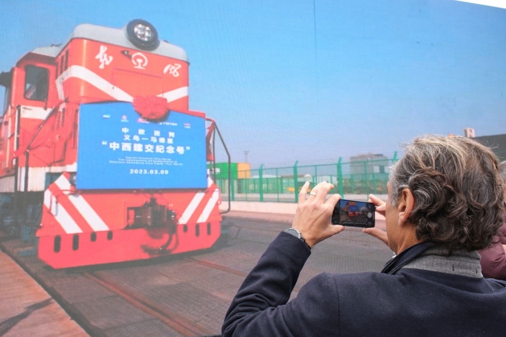 2023年3月9日,一列裝載著小商品、電子產(chǎn)品、日用百貨等貨物的“中西建交紀念號”中歐班列從浙江義烏鐵路西站奔赴西班牙首都馬德里。一列裝載著紅酒、橄欖油等西班牙特色產(chǎn)品的班列也從馬德里出發(fā),相向而行,駛向義烏。