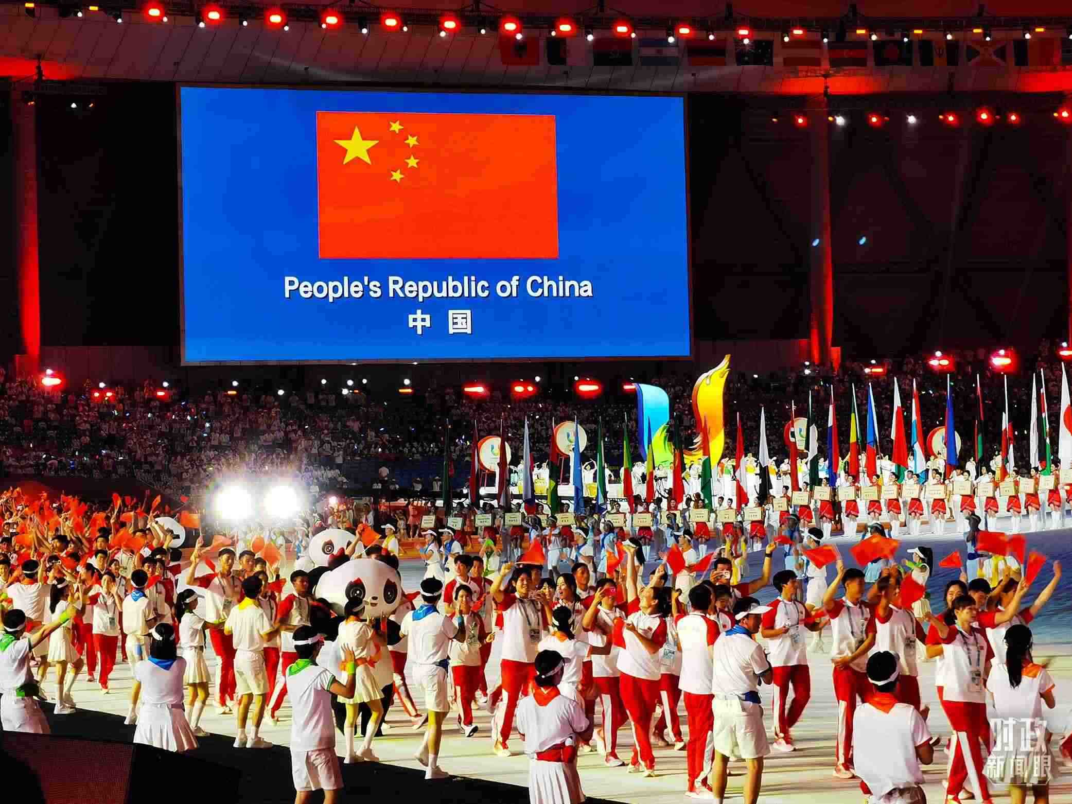 △中國大學(xué)生體育代表團(tuán)在開幕式上入場。(總臺(tái)央視記者張淳拍攝)