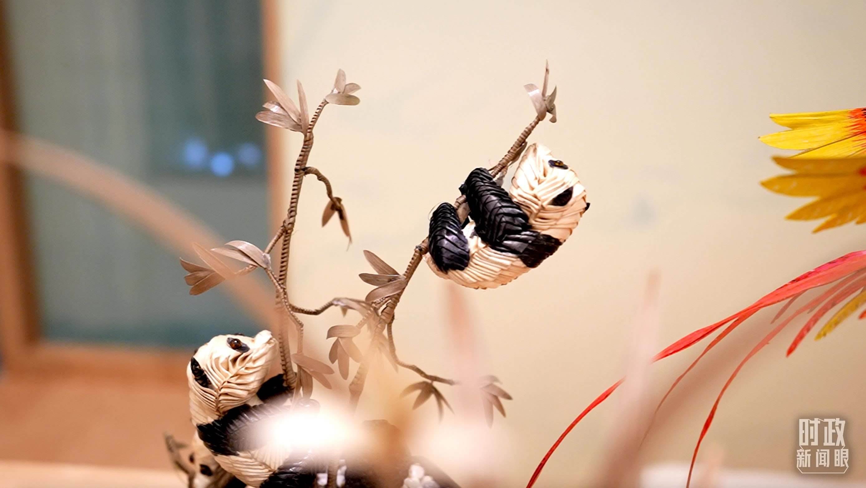 △為國際貴賓展示的四川非物質(zhì)文化遺產(chǎn)棕編和蜀繡。(總臺(tái)央視記者蔣碩、韓銳拍攝)