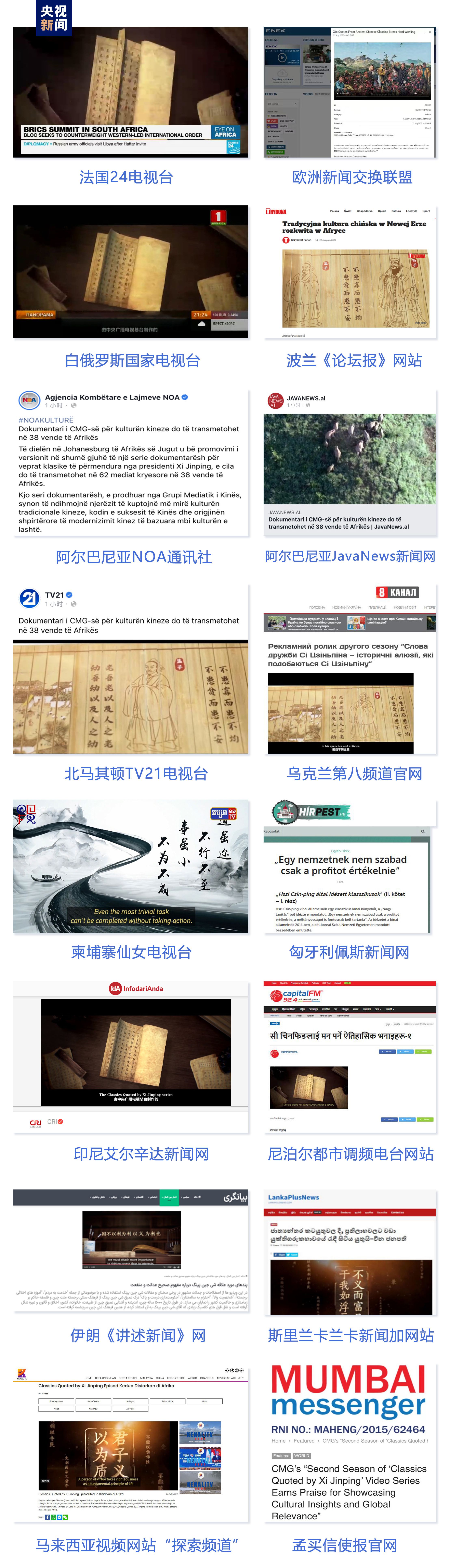 截至8月23日18時,《平“語”近人——習(xí)近平喜歡的典故》第二季持續(xù)在非洲廣播聯(lián)盟、開普敦電視臺、南非獨(dú)立傳媒、開普敦亞洲形象資訊集團(tuán)、南非金磚電視臺、肯尼亞國家電視臺、肯尼亞廣播公司、肯尼亞首都調(diào)頻、肯尼亞Africa Live電視臺、剛果(金)日報網(wǎng)、埃及DMC電視臺、埃及開羅24小時網(wǎng)、津巴布韋廣播公司、津巴布韋《先驅(qū)報》等50余個非洲國家的107家主流媒體廣泛播出。