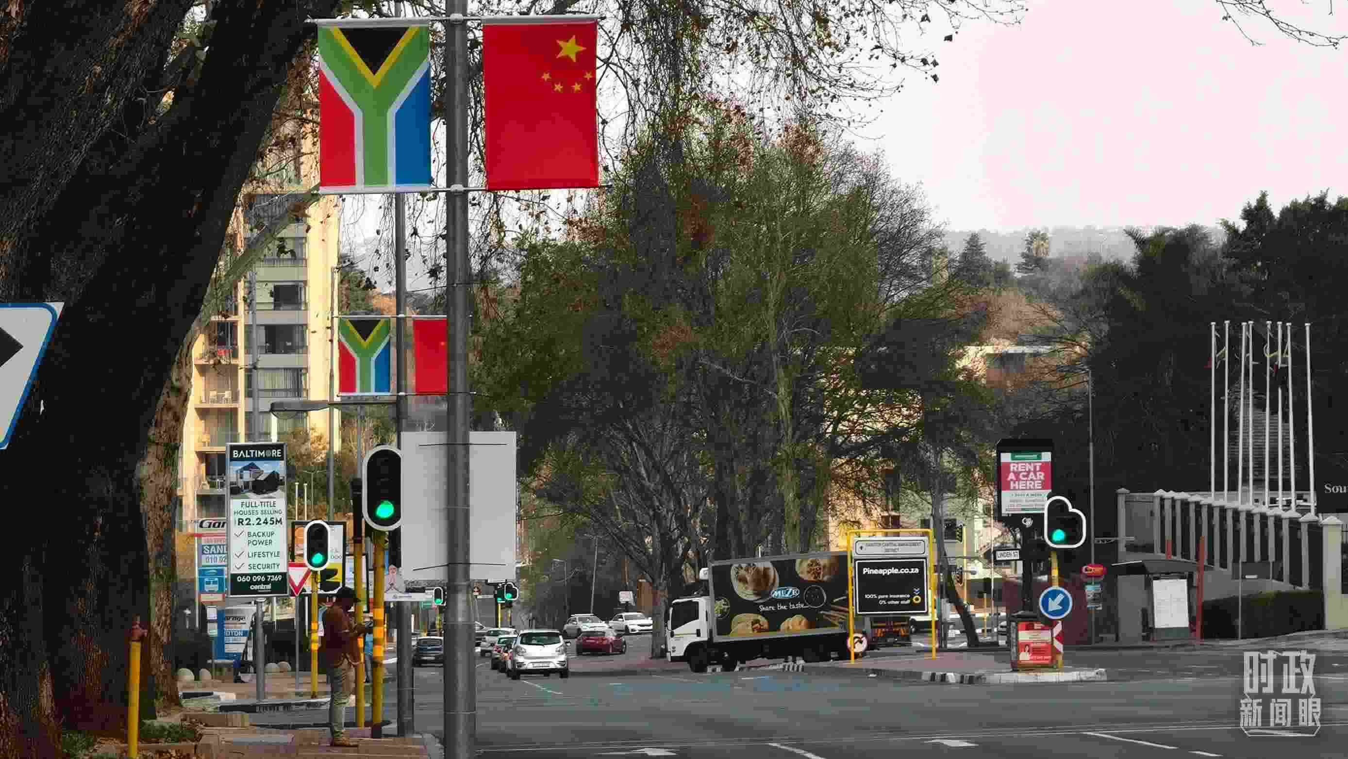 △約翰內(nèi)斯堡街道兩側(cè)懸掛的中國國旗。(總臺(tái)央視記者韓銳拍攝)
