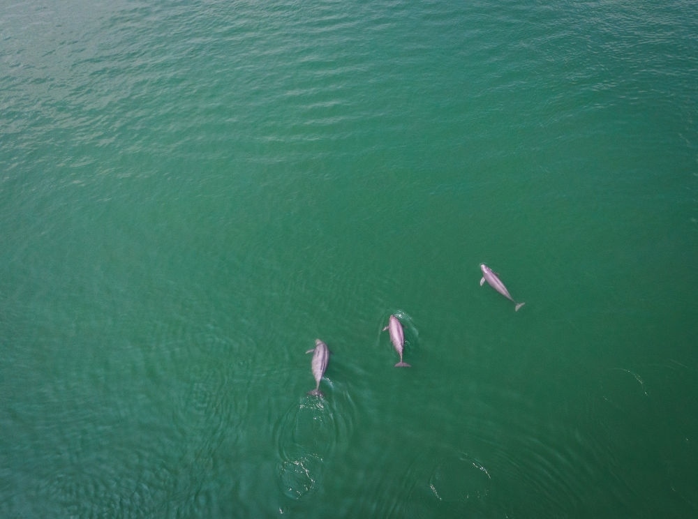這是2021年5月11日在湖北省宜昌市拍攝的在水中嬉戲的長江江豚(無人機照片)。新華社記者 肖藝九 攝