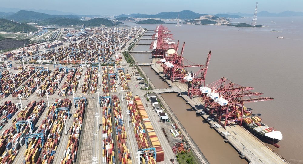 貨輪停靠在寧波舟山港穿山港區(qū)裝卸貨物(2023年5月9日攝,無人機照片)。新華社記者 翁忻旸 攝