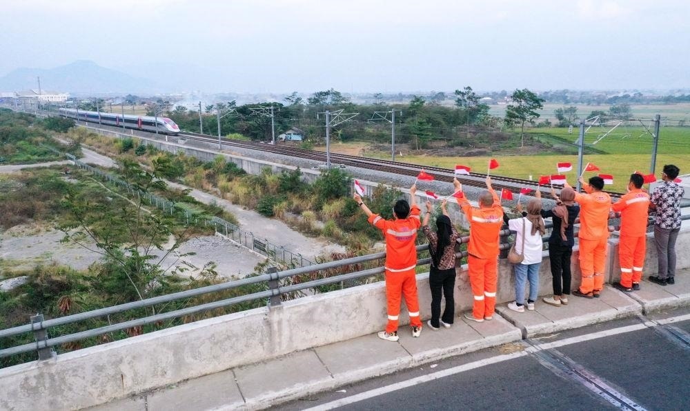 △2023年10月17日,在印度尼西亞萬(wàn)隆一座天橋上,雅萬(wàn)高鐵中國(guó)建設(shè)者和印尼籍員工揮舞著中國(guó)和印尼兩國(guó)國(guó)旗,向遠(yuǎn)處駛來(lái)的一列雅萬(wàn)高鐵高速動(dòng)車(chē)組列車(chē)歡呼。