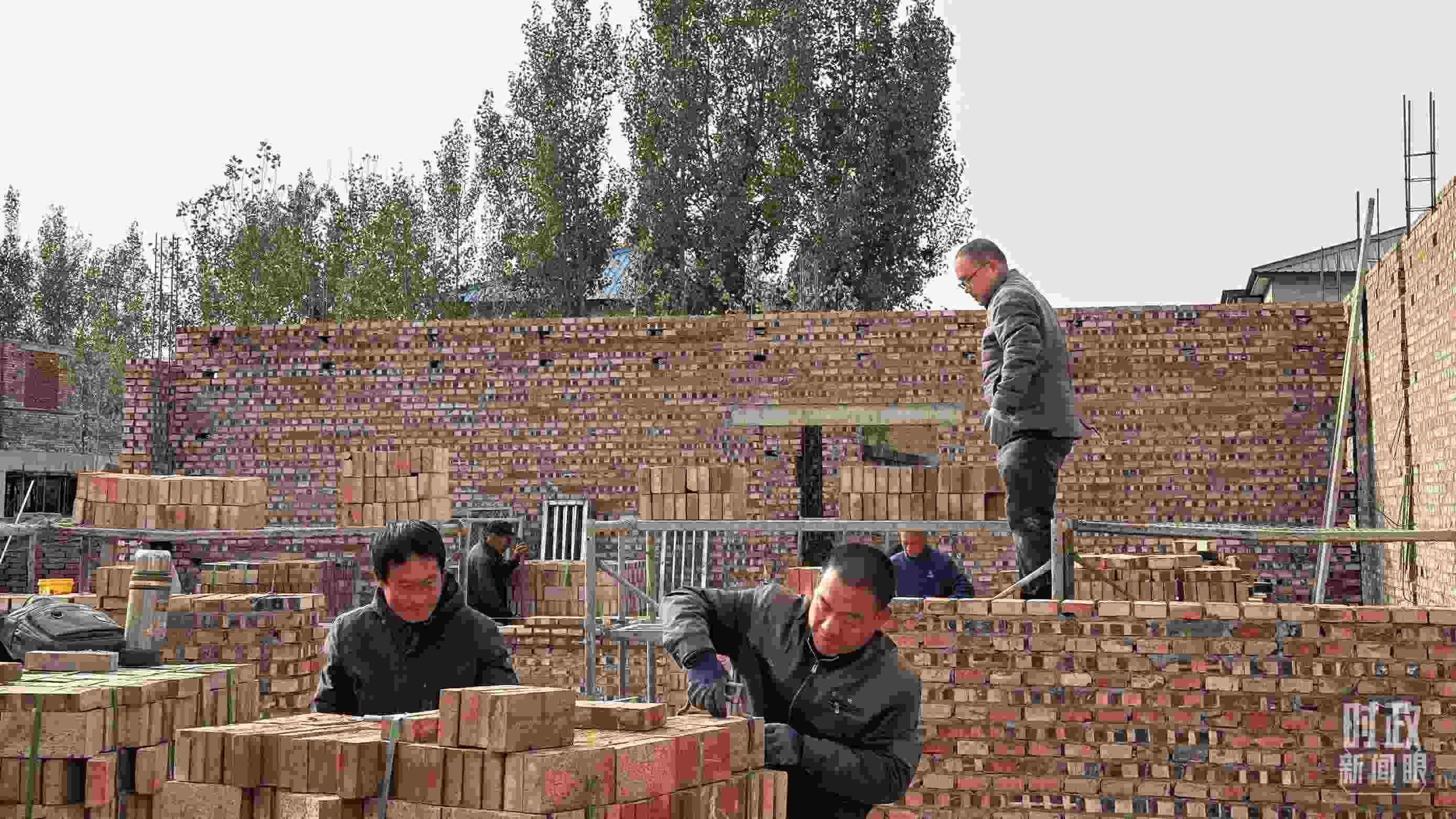 △ 刁窩鎮(zhèn)萬全莊村,施工隊(duì)在建設(shè)新房。(總臺(tái)央視記者郁振一拍攝)