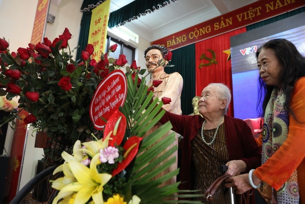 2018年9月30日,在越南河內(nèi)市嘉林縣驕騎鄉(xiāng),洪水將軍親屬向其雕像獻(xiàn)花。新華社記者王迪攝