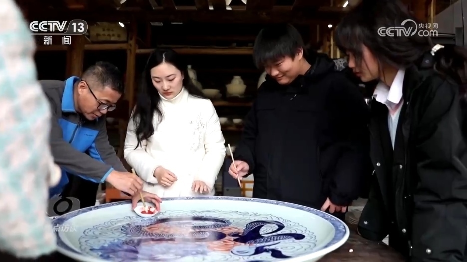 春節(jié)將近,景德鎮(zhèn)青花瓷畫坯技藝非遺傳承人孫立新和徒弟們正在制作迎接新年的龍盤,要在這個直徑1米的瓷盤上用龍的造型呈現(xiàn)出福字。