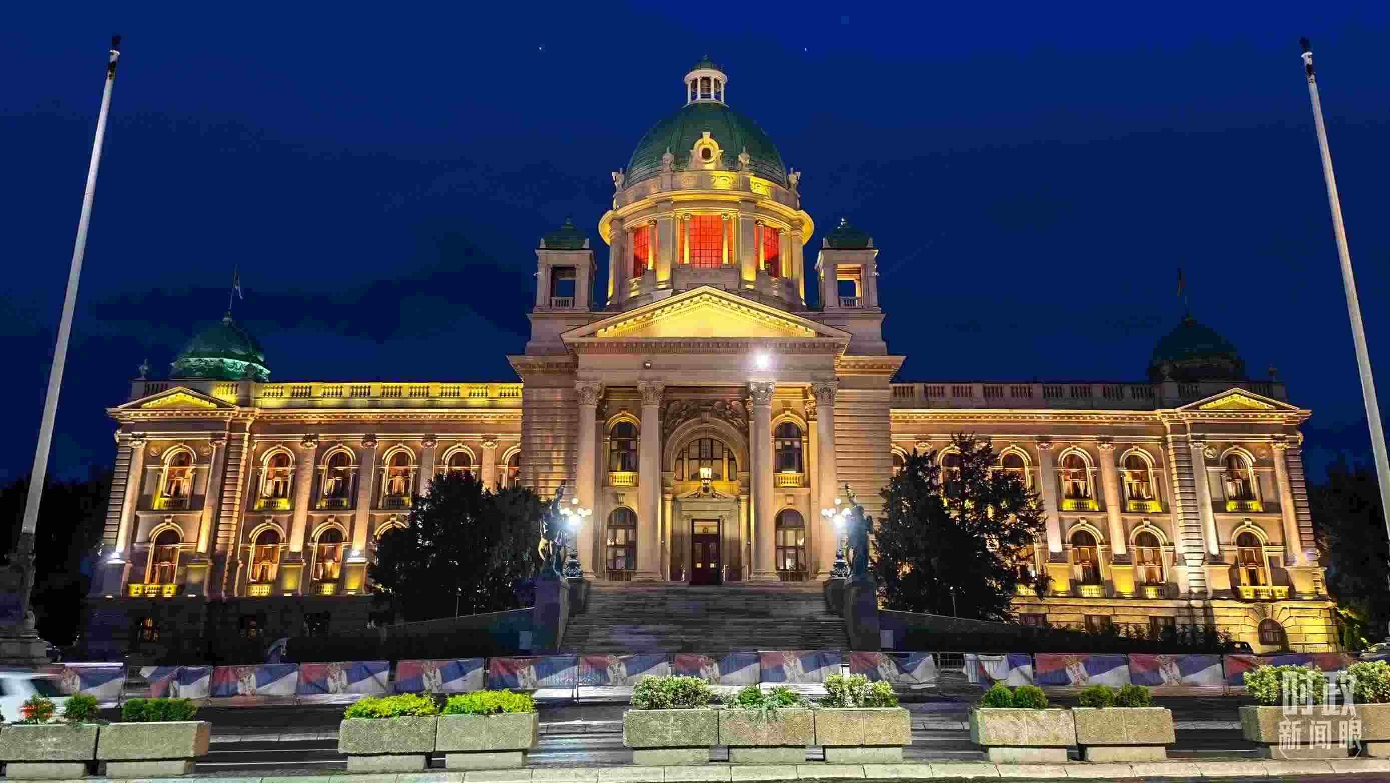 △塞爾維亞國(guó)會(huì)大廈亮起紅燈,歡迎習(xí)主席到訪。(總臺(tái)央視記者石丞拍攝)