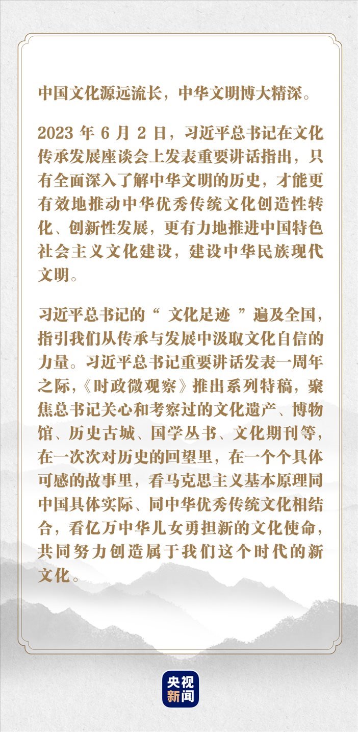 而今,我們起而行之,全面深入了解中華文明的歷史,推動(dòng)中華優(yōu)秀傳統(tǒng)文化創(chuàng)造性轉(zhuǎn)化、創(chuàng)新性發(fā)展,擔(dān)負(fù)起新的文化使命。