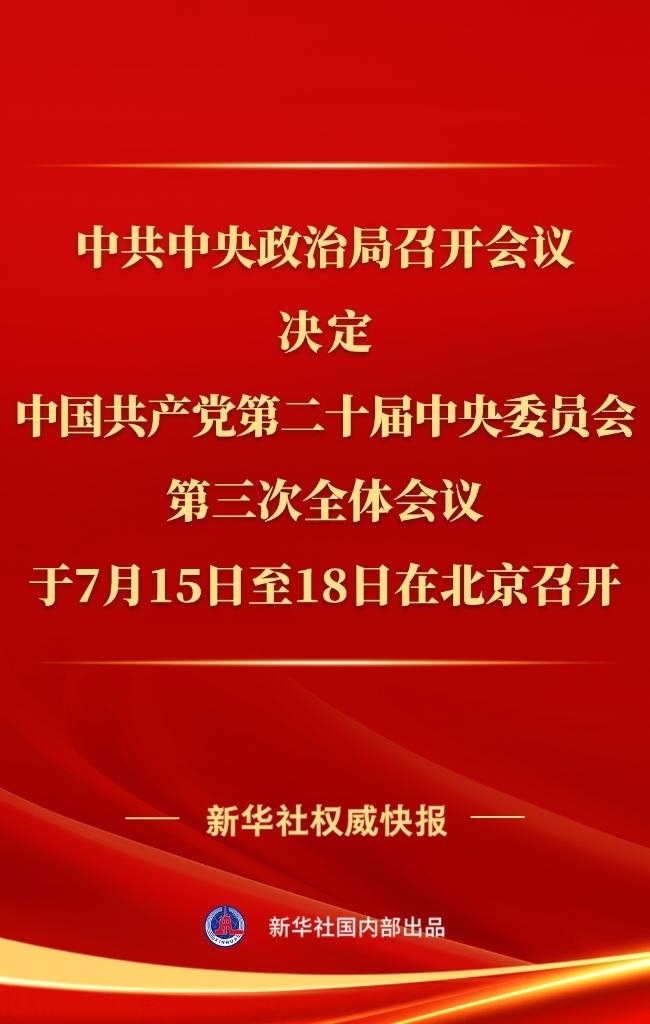 中共中央政治局6月27日召開會議,研究進(jìn)一步全面深化改革、推進(jìn)中國式現(xiàn)代化問題。中共中央總書記習(xí)近平主持會議。會議決定,中國共產(chǎn)黨第二十屆中央委員會第三次全體會議于7月15日至18日在北京召開。