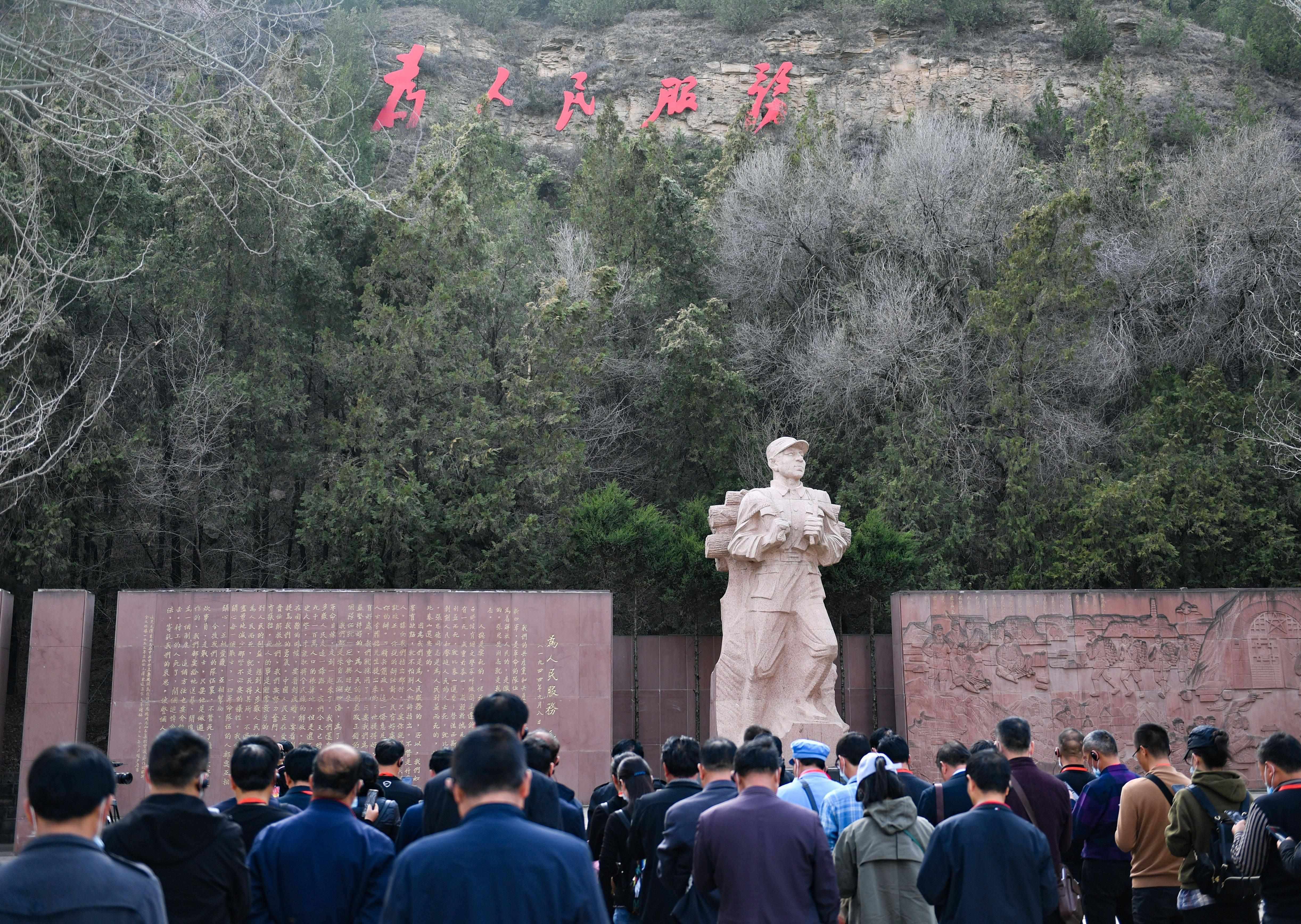 延安棗園,《為人民服務(wù)》講話紀(jì)念廣場(chǎng),張思德負(fù)薪前行的雕像,巍然屹立,“為人民服務(wù)”5個(gè)鮮紅大字,熠熠生輝?!熬哂腥娜鉃橹袊?guó)人民服務(wù)的精神”,在黨的七大上被寫進(jìn)黨章。